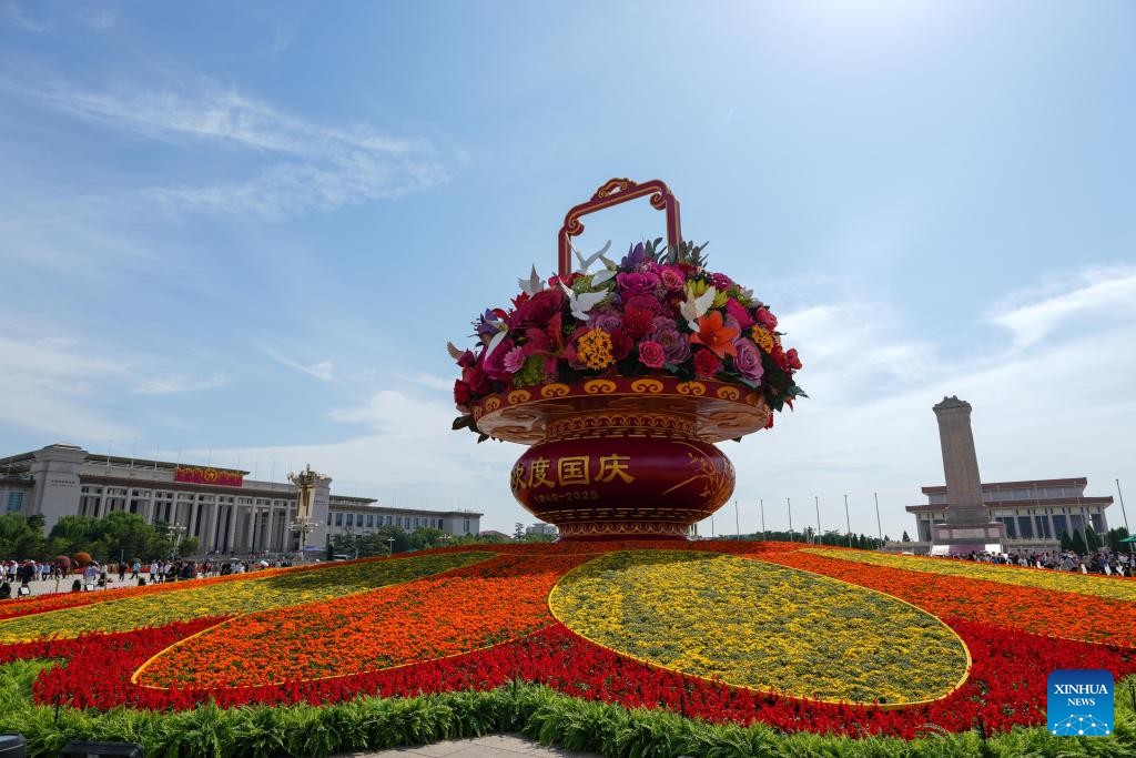 | 25 ستمبر 2025۔ بیجنگ کے تھیان آن من سکوائر پر سجی 18 میٹر اونچی پھولوں ٹوکری کی شکل میں نصب کی جانے والی یہ آرائش ، چین کے آنے والے قومی دن کی مناسبت سے کی جانے والی بے حد خوبصورت آرائش ہے۔ (شنہوا/ جو ہوا زونگ ) |