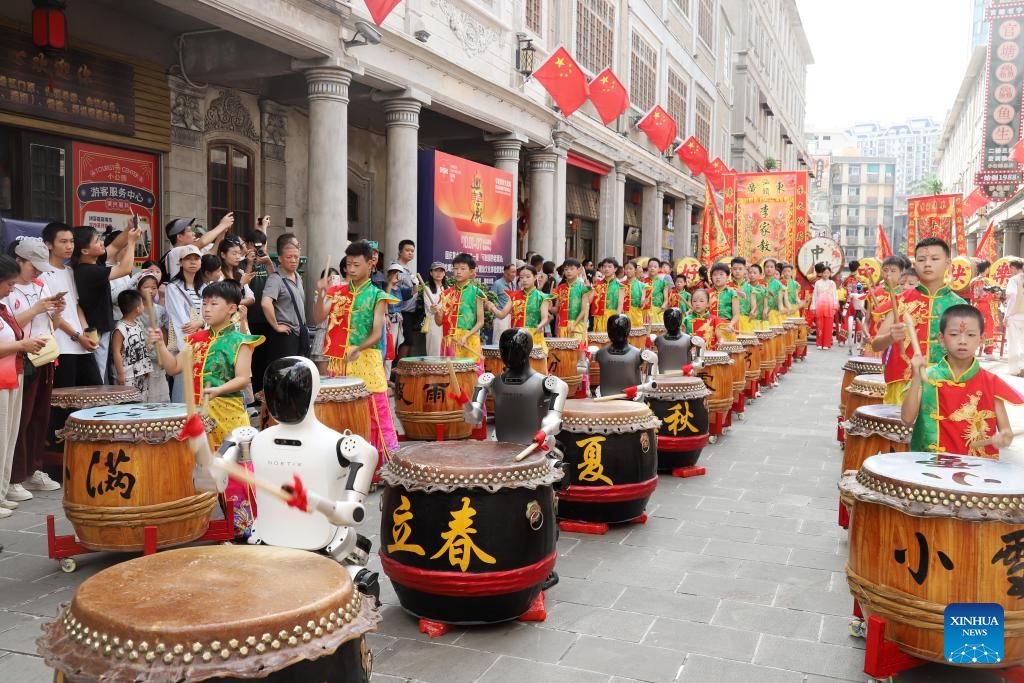 | 6 اکتوبر 2025 ۔ صوبہ گوانگ دونگ کے شہر شان تھو میں فنکار اور روبوٹس ،وسط خزاں تہوار کی مناسبت سے منعقدہ سرگرمی میں روایتی ڈھول پیٹ رہے ہیں۔ چین بھر میں وسط خزاں تہوار کی مناسبت سے مختلف روایتی ثقافتی تقریبات کا انعقاد کیا گیا جن میں لوگوں کی ایک بڑی تعداد نے شرکت کی۔ (یاو جن/شنہوا) |