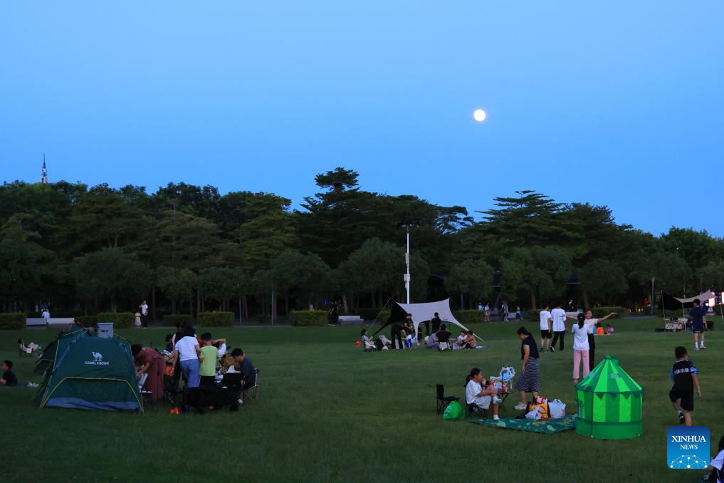 | 6 اکتوبر 2025۔صوبہ گوانگ دونگ کے شہر شینزن کی ایک کیمپ سائٹ ،جہاں لوگ پورے چاند کا دلکش منظر دیکھنے کے لیے اکٹھے ہوئے۔ چین بھر میں لوگوں نے وسط خزاں تہوار منانے کے لیے مختلف روایتی ثقافتی تقریبات میں شرکت کی۔(ماو سیچیان/شنہوا) |