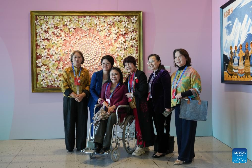 | 13 اکتوبر 2025۔ بیجنگ میں منعقدہ "گلوبل لیڈرز میٹنگ آن ویمن" کے دوران خصوصی نمائش "ہیریٹیج بلاسمز ، ویمن شائن" میں ایک وفد کی شرکا گروپ فوٹوبنوا رہی ہیں۔(شنہوا/شو بنگ جیئے) |