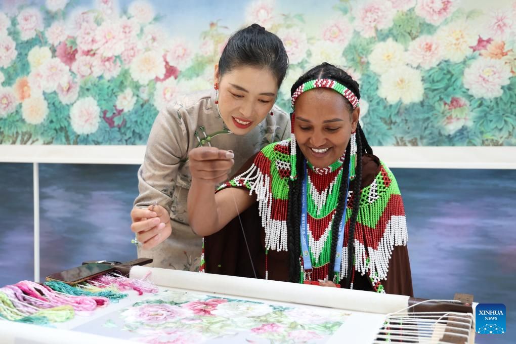 14 اکتوبر 2025۔ بیجنگ میں خواتین اور بچیوں کے لیے چین کی "ڈیجیٹل اینڈ انٹیلیجنٹ ایمپاورمنٹ "کی ترقی سے متعلق نمائش میں بوٹسوانا کے وفد کی ایک مہمان خاتون چینی کڑھائی کا تجربہ کر رہی ہیں۔ منگل کے روز منعقد کی جانے والی یہ نمائش "گلوبل لیڈرز میٹنگ آن ویمن" کی ایک ذیلی سرگرمی تھی ۔(شنہوا/ جانگ یو وئے) |