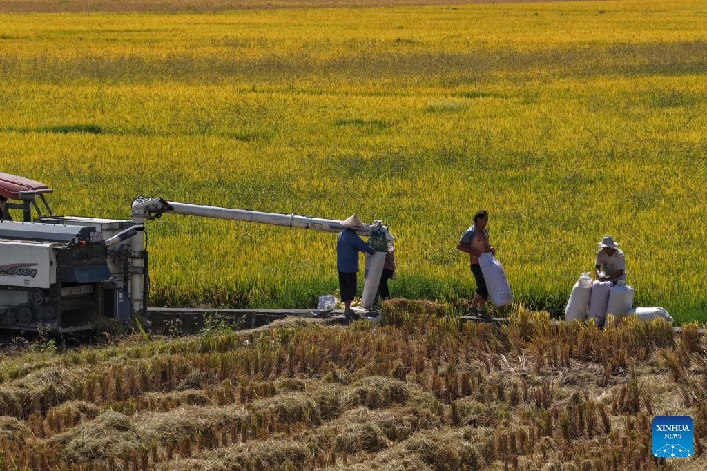 | 15 اکتوبر 2025۔صوبہ حو نان کی کاونٹی شوانگ فینگ میں کھیتوں میں کٹائی کا فضائی منظر ۔ ( لی جیان شن/شنہوا) |