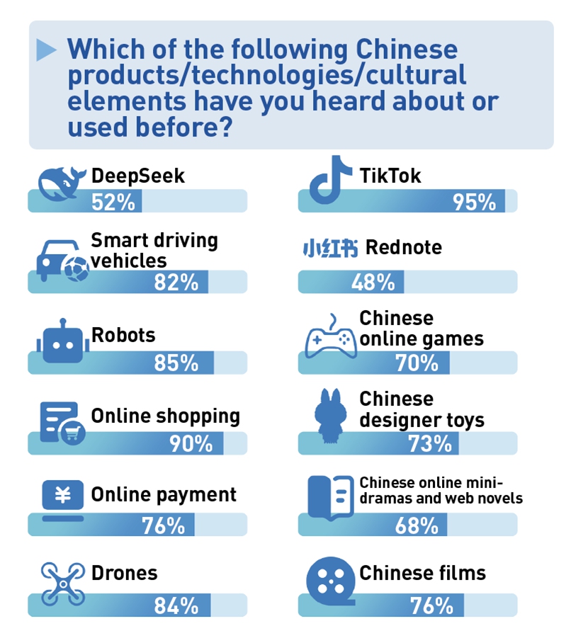 90 فیصد سے زیادہ غیر ملکی جواب دہندگان نے چین میں دلچسپی ظاہر کی ہے، جن میں سے 40 فیصد سے زیادہ نے غیر معمولی دلچسپی ظاہر کی۔ ترقی یافتہ ممالک کی جانب سے سب سے زیادہ دلچسپی کا شعبہ "ثقافت" رہا، جبکہ ترقی پذیر ممالک میں "ٹیکنالوجی"میں بے حد دلچسپی دکھائی گئی ہے۔ سروے میں گزشتہ چند سالوں میں چین سے متعلق مختلف ابھرتے ہوئے مظاہر کی فہرست میں غیر ملکی رائے دہندگان کی جانب سے ٹک ٹاک اور آن لائن شاپنگ کےاستعمال کی شرح تقریباً 60 فیصد ہے۔ روبوٹس، ڈرونز، اور سمارٹ ڈرائیونگ کے لیے 80 فیصد سے زیادہ پسندیدگی رہی۔
